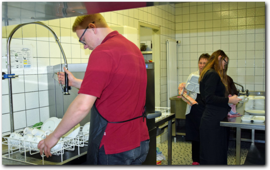 Ganz wichtig ist für uns der Spüldienst in der Küche der Rems-Murr-Halle, denn wir wollen unsere Speisen möglichst auf gutem Geschirr ausgeben. Nur Pommes, Rote und Currywurst gibt es in Pappschalen, natürlich nur mit einem Pickser aus Buchenholz, nicht aus Plastik