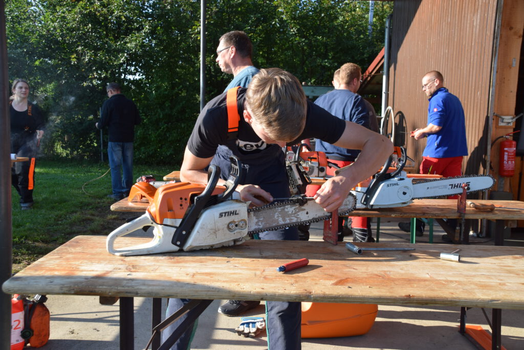 Ebenso die Wartung der Motorsägen, bevor es zum Baumfällen in den Leutenbacher Wald ging