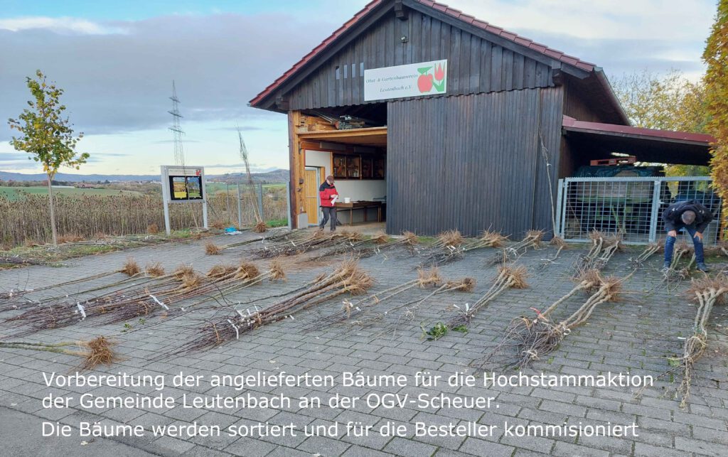 Jedes Jahr im November bereiten wir hier die Bäume für die Ausgabe bei der jährlichen Hochstamm-Aktion der Gemeinde Leutenbach vor. In der OGV-Scheuer werden sie für die Besitzer von Leutenbacher Streuobstwiesen, nach deren Bestellung, sortiert und gebündelt und bereit gestellt